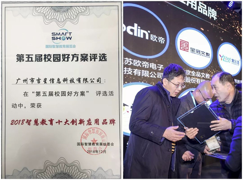 在2018國際智慧教育展上,吉星展示了基于數(shù)字化校園以學(xué)生為中心的智慧課堂分組互動(dòng)教學(xué)系統(tǒng)方案收獲了客戶的一致好評(píng),并榮獲 2018“校園好方案”優(yōu)秀案例,吉星信息科技被評(píng)為2018智慧教育十大創(chuàng)新應(yīng)用品牌!