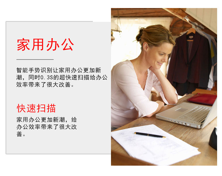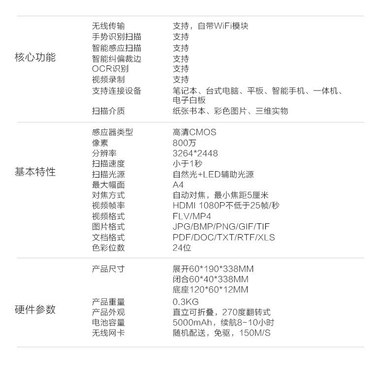 無線傳輸、手勢識別掃描、智能感應掃描、智能糾偏裁邊、OCR識別、視頻錄制等